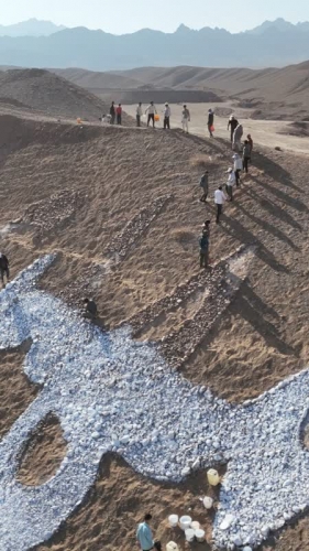 دیگر به غروب آفتاب نزدیک شدیم. گروه آخر، گروه رنگکارها هستند که روی سنگهای چیدهشده در حروف، با رنگپاشهای دستی، سنگها را مثل باغبانی که گلها، اما سنگها را رنگآمیزی میکنند.
